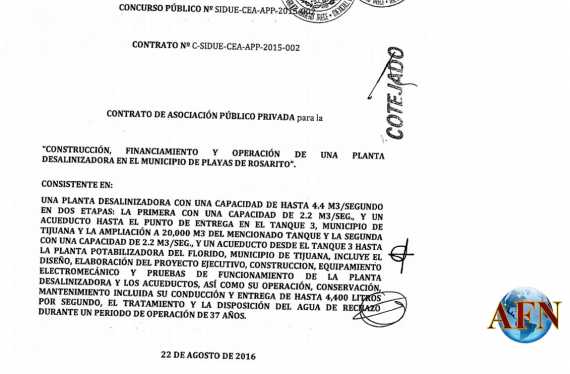 El contrato a esta empresa fue signado por el entonces Secretario de Planeación y Finanzas del estado, Antonio Valladolid Rodríguez, Germán Jesús Lizola Márquez, entonces director de la Comisión Estatal del Agua, y como obligado solidario el director de la Comisión Estatal de Servicios Públicos de Tijuana (CESPT), Miguel Lemus Zendejas.