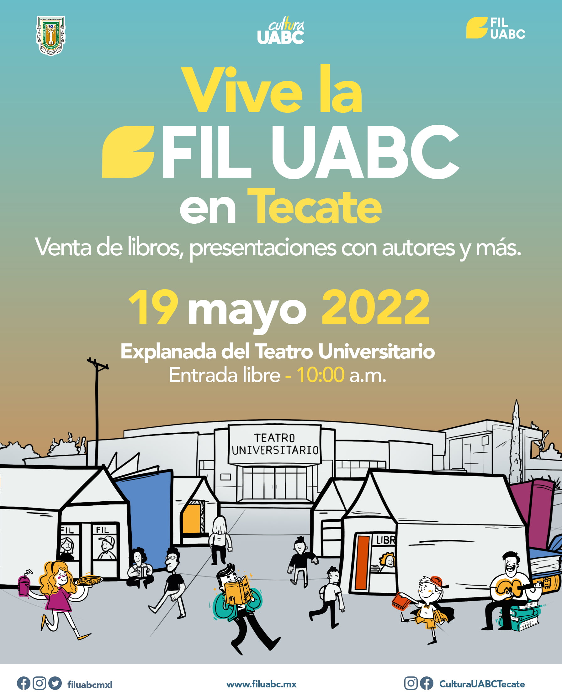 TECATE.- El próximo jueves 19 de mayo, algunas de las actividades de la Feria Internacional del Libro de la Universidad Autónoma de Baja California (FIL UABC) se vivirán en Tecate. Habrá presentaciones y venta de libros, música y lecturas en voz alta en la explanada del Teatro UABC, Unidad Tecate, ubicada en Calzada Universidad 1, fraccionamiento San Fernando, de 10:00 a 19:00 horas con admisión libre.
