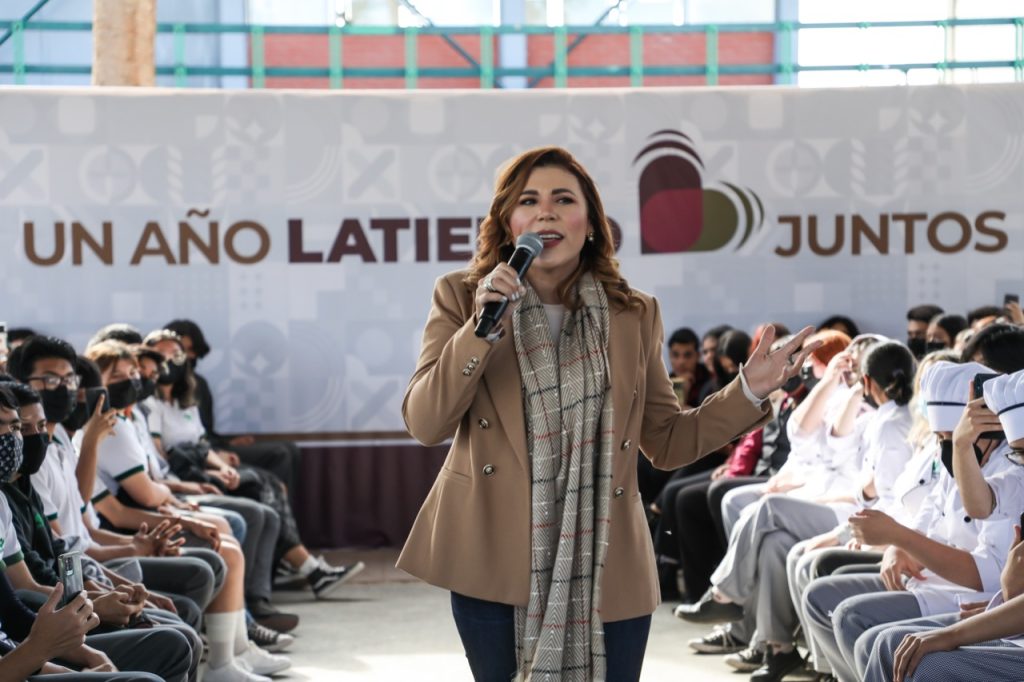 Recibiendo un gran apoyo de las y los alumnos de preparatoria, la Jefa del Poder Ejecutivo del Estado presentó los principales logros de su primer año de Gobierno, especialmente en lo que se refiere a apoyos la Educación y para el desarrollo de las y los jóvenes bajacalifornianos.