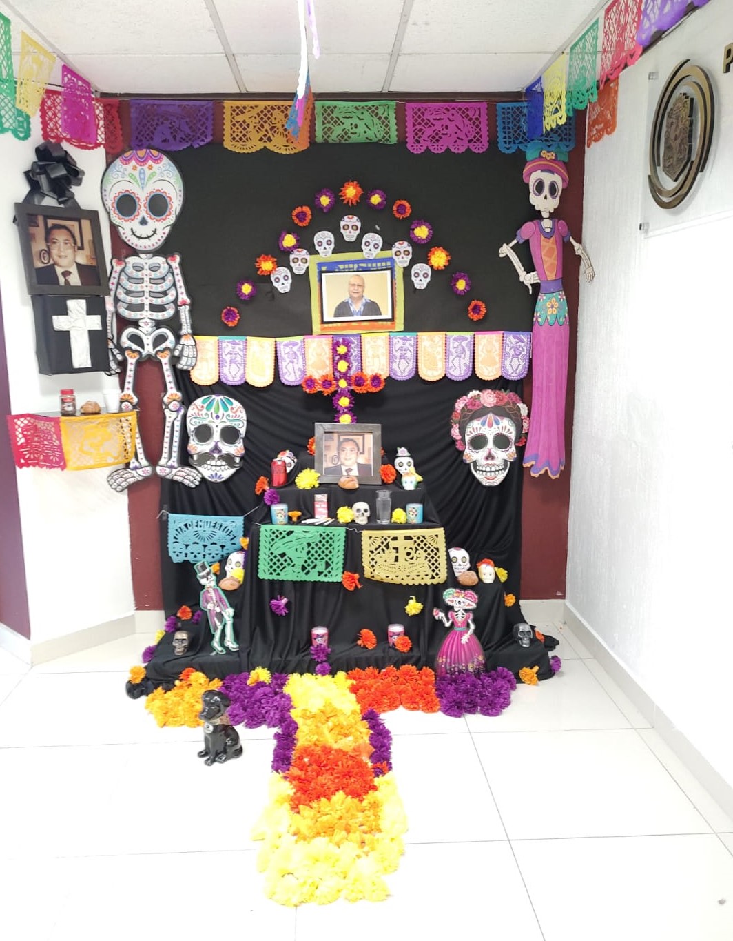 En dicho altar, en donde no podía faltar la cruz, las flores de colores, el perro negro, veladoras y calaveritas, se resaltaron los gustos particulares de quien fue un gran amigo y maestro para los compañeros del área, como son: su libreta de apuntes, la pluma y un tarro de café.
