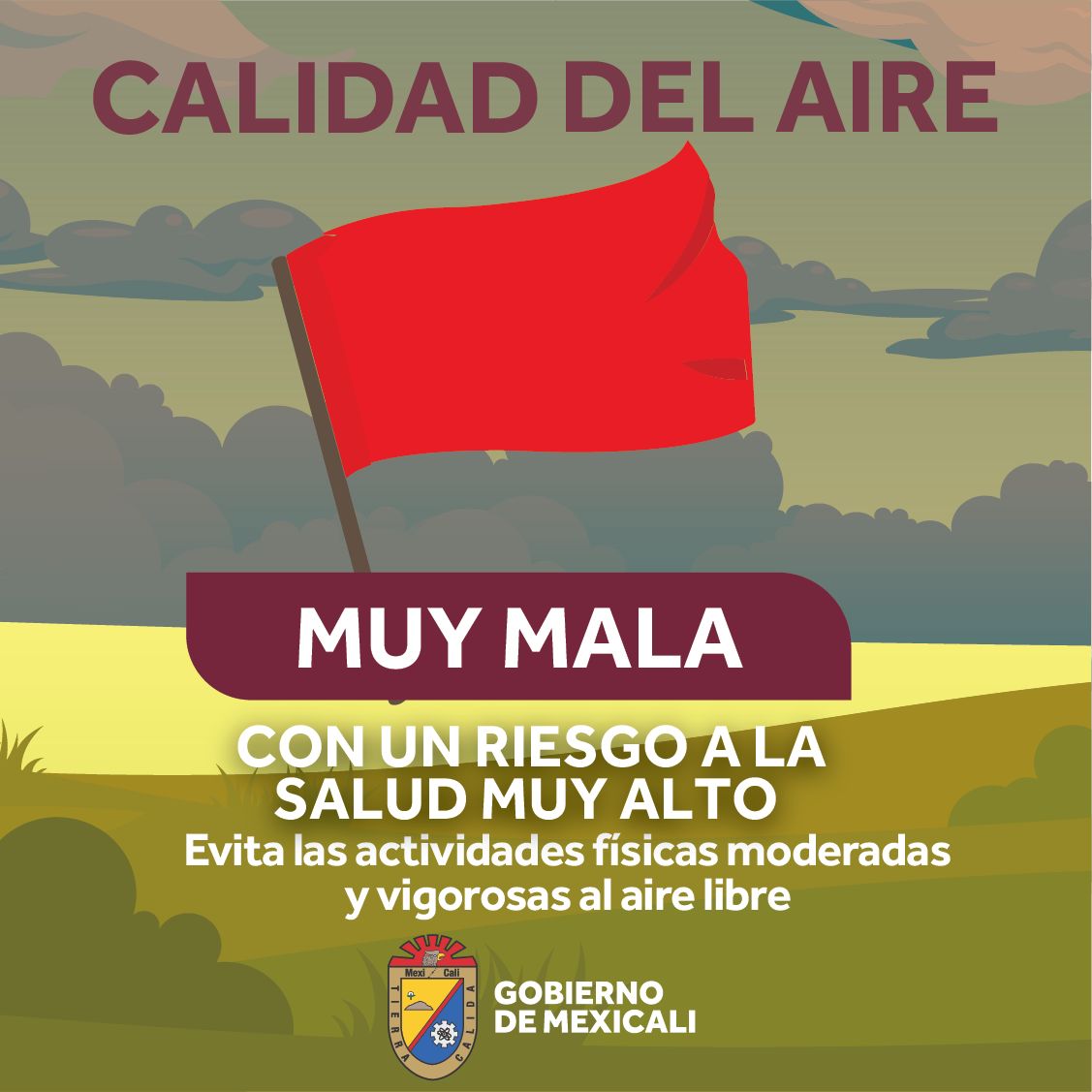 🔺🔺¡ALERTA!🔺🔺 🔴BANDERA ROJA 🚨 Hasta el momento, según el Índice Aire y Salud, la Estación Municipal de Monitoreo de Calidad del Aire indica que nos encontramos con una calidad del aire MUY MALA con un riesgo para la salud ALTO, por lo que se recomienda a la población: – No realices actividades al aire libre. – Acude al médico si se presentan síntomas respiratorios o cardiacos – Evita las actividades físicas moderadas y vigorosas al aire libre. – Para conocer la calidad del aire de Mexicali visite los siguientes sitios: • Estación Municipal de Monitoreo de Calidad del Aire https://bit.ly/calidaddelaireemmca • Purple Air https://map.purpleair.com/1/ls/mAQI/a10/p604800/cC0… • Redspira http://app.respira.org.mx/… #CALIDADDELAIRE #MEXICALI