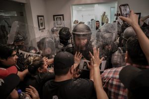 Tras más de 20 minutos de enfrentamiento, los ciudadanos entraron a la Sala de Sesiones, que permaneció con la luz apagada, mientras gritaban consignas y tomaban la tribuna del Congreso de Baja California, donde permanecen.