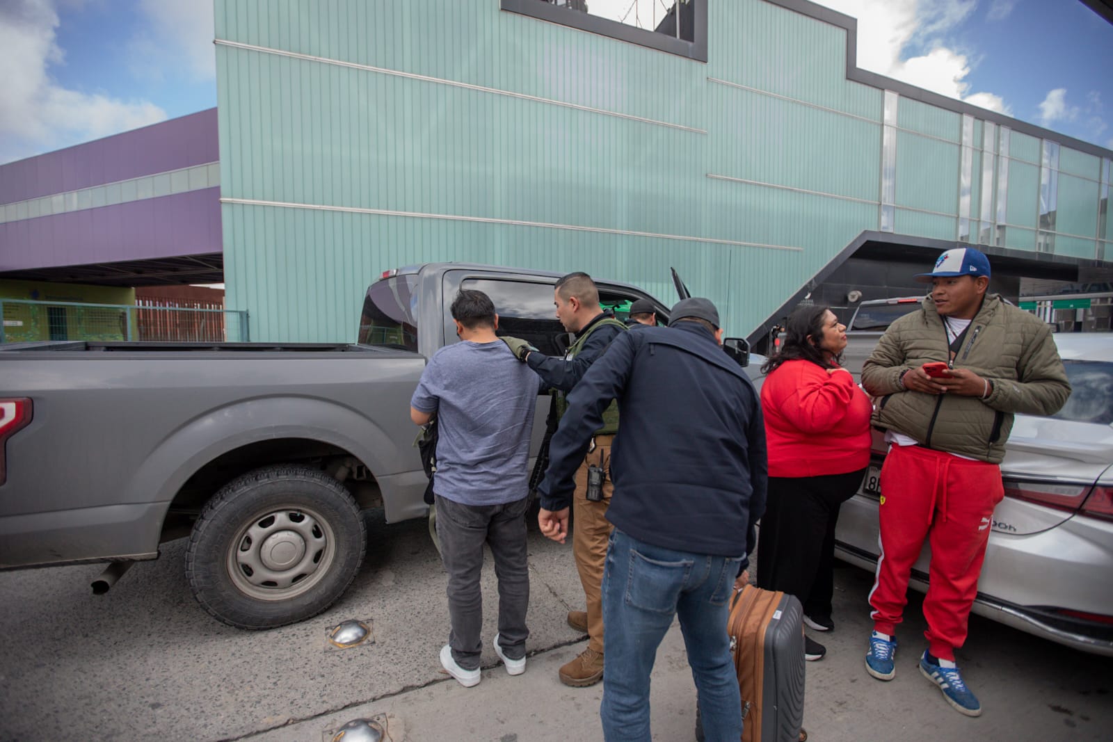 Unidades tipo Pick up de la Fiscalía General del Estado llegaron al Aeropuerto para llevarse a la menor, quien salió cubierta con una sudadera y acompañada de una mujer.