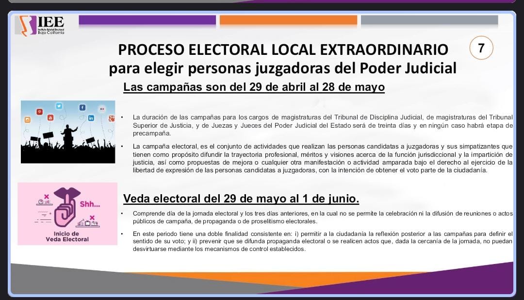 MEXICALI.- Este martes arrancan las campañas electorales de las personas que buscan cargos en los juzgados locales, Tribunal Superior de Justicia del Estado y del Tribunal de Disciplina del Poder Judicial, proceso que termina el próximo 28 de mayo.