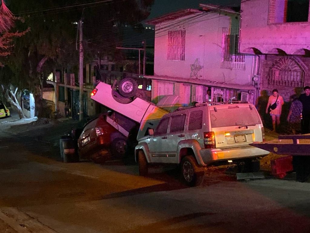 Una camioneta Pick Up Ford Ranger protagonizó una aparatosa volcadura la noche del lunes 25 de agosto en la calle El Sauce, esquina con avenida Gardenia en la colonia La Morita, dejando como saldo al menos cuatro vehículos afectados y una pareja con lesiones menores.