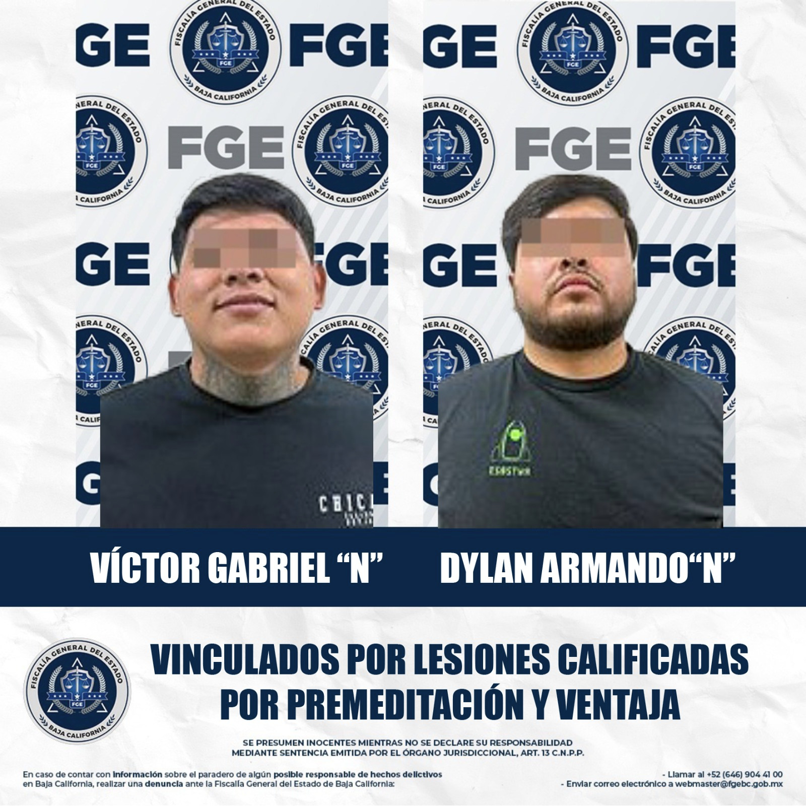 MEXICALI, BAJA CALIFORNIA, A 8 DE OCTUBRE DE 2025.- La Fiscalía General del Estado, a través de la Fiscalía Regional de Mexicali, obtuvo auto de vinculación a proceso en contra de Víctor Gabriel “N” y Dylan Armando “N”, por su presunta responsabilidad en el delito de lesiones calificadas por premeditación y ventaja, en agravio de un estudiante universitario.