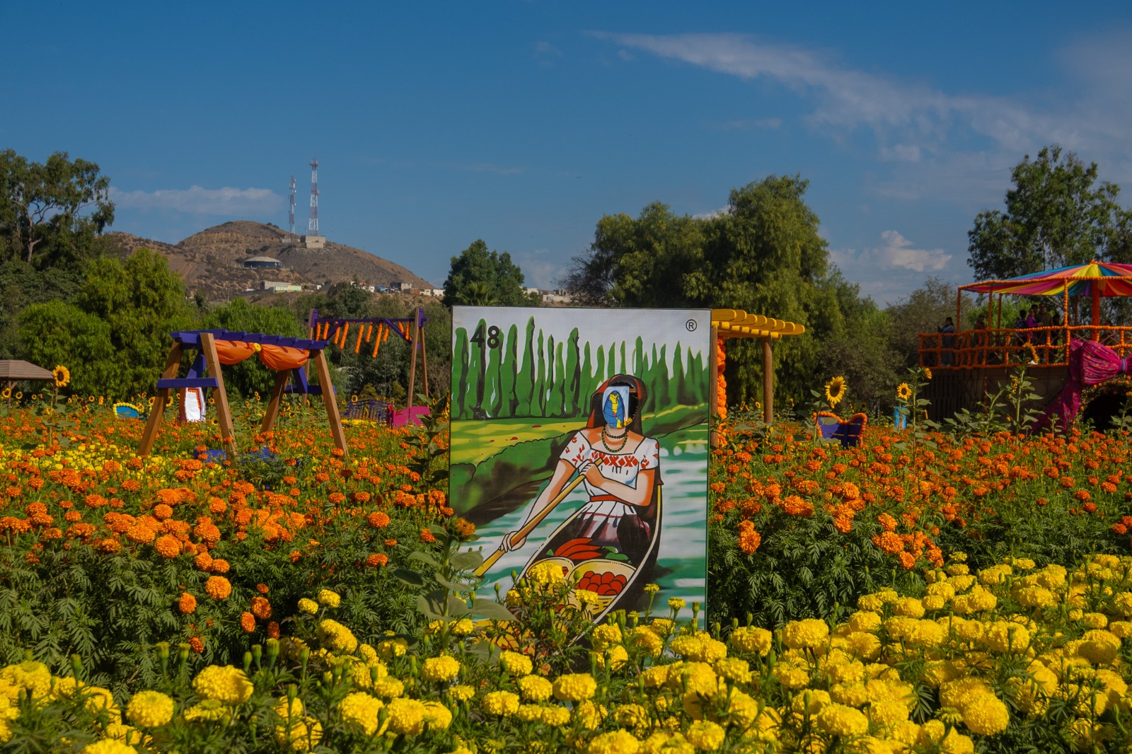El recorrido por Mictlán comienza entre senderos cubiertos de flores de cempasúchil, conocidas como las “flores de muerto”, símbolo esencial del Día de Muertos por su color, aroma y su papel como guía para las almas que regresan al mundo de los vivos.