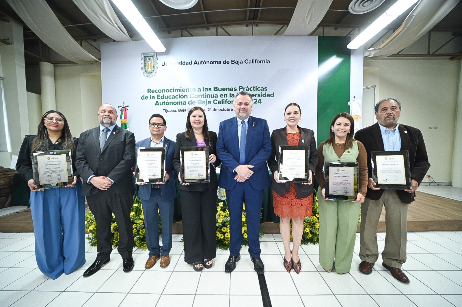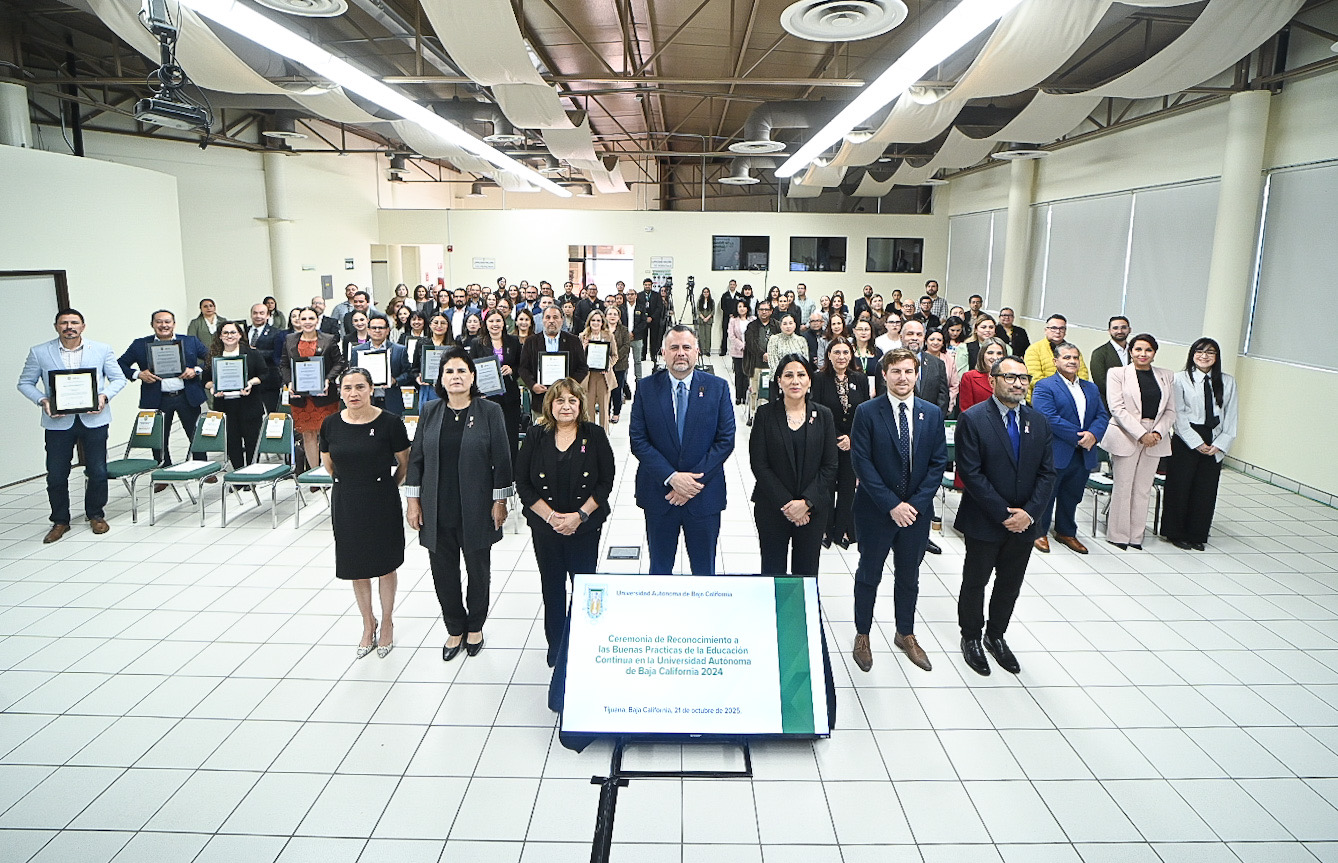 Tijuana, Baja California, martes 21 de octubre de 2025.- La Universidad Autónoma de Baja California (UABC), a través del Centro de Educación Continua (CEC), llevó a cabo la ceremonia de entrega de Reconocimiento a las Buenas Prácticas de la Educación Continua 2024, en la que se distinguió a 15 unidades académicas y 17 programas de responsabilidad social universitaria por su contribución a la formación profesional, la innovación educativa y el compromiso social.