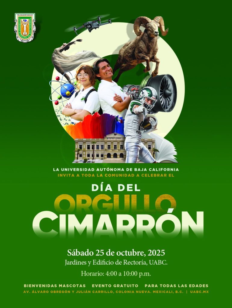 Mexicali, Baja California, miércoles 22 de octubre de 2025.- La Universidad Autónoma de Baja California (UABC) invita a toda la comunidad cimarrona y público en general a participar en el Día del Orgullo Cimarrón 2025, que se realizará el viernes 25 de octubre, de 16:00 a 21:00 horas, en los jardines de Rectoría.
