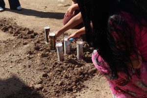 Sobre un montículo de tierra que sus vecinas usaron para cubrir la sangre de su amiga, vecinas colocan veladoras para despedir a Melanie Jocelyn, víctima de feminicidio por su pareja sentimental y madre de tres niños.