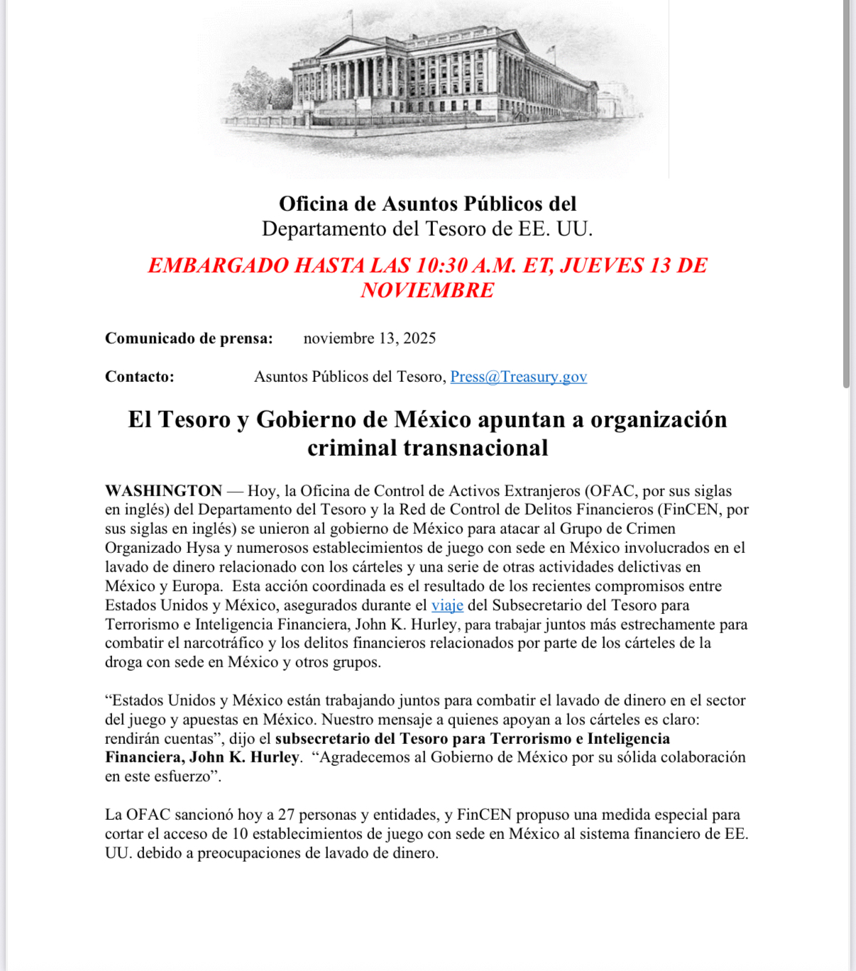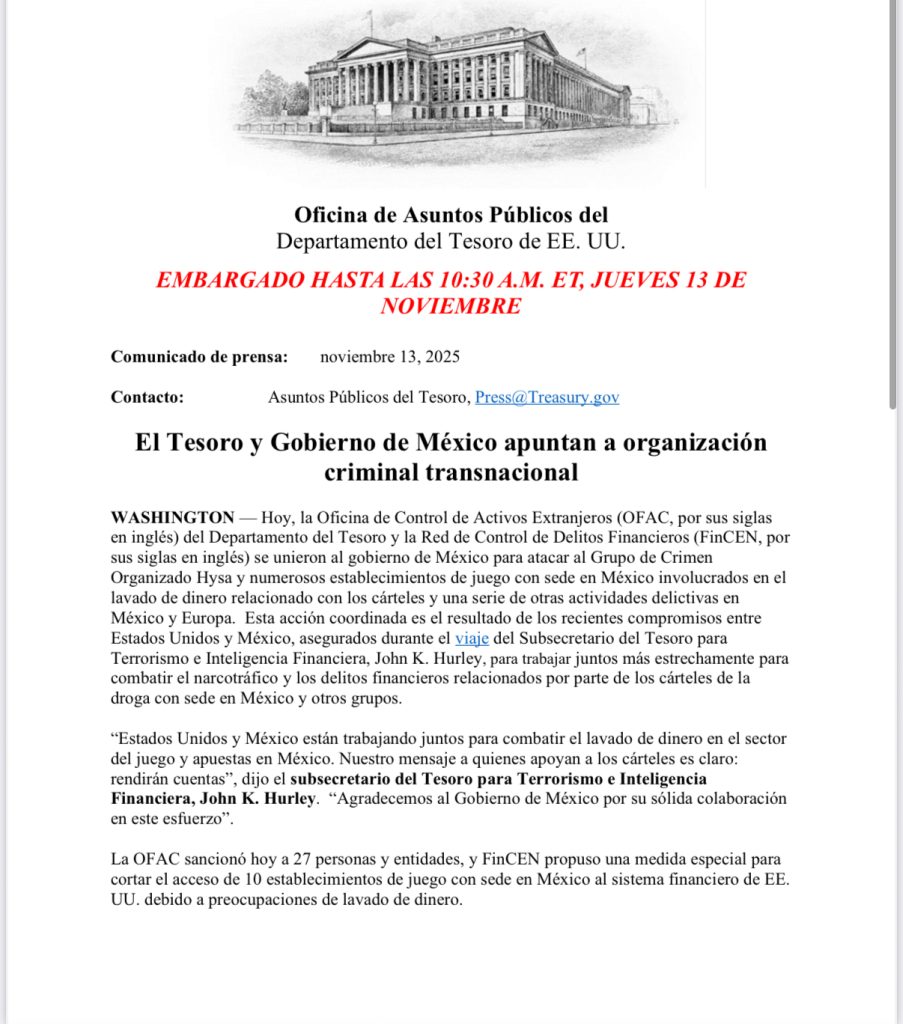 El Departamento del Tesoro de Estados Unidos, en coordinación con el Gobierno de México, anunció sanciones contra el Grupo de Crimen Organizado Hysa, una red transnacional dedicada al lavado de dinero proveniente del narcotráfico, con operaciones en México, Europa y Canadá, y presuntos vínculos con el Cártel de Sinaloa.
