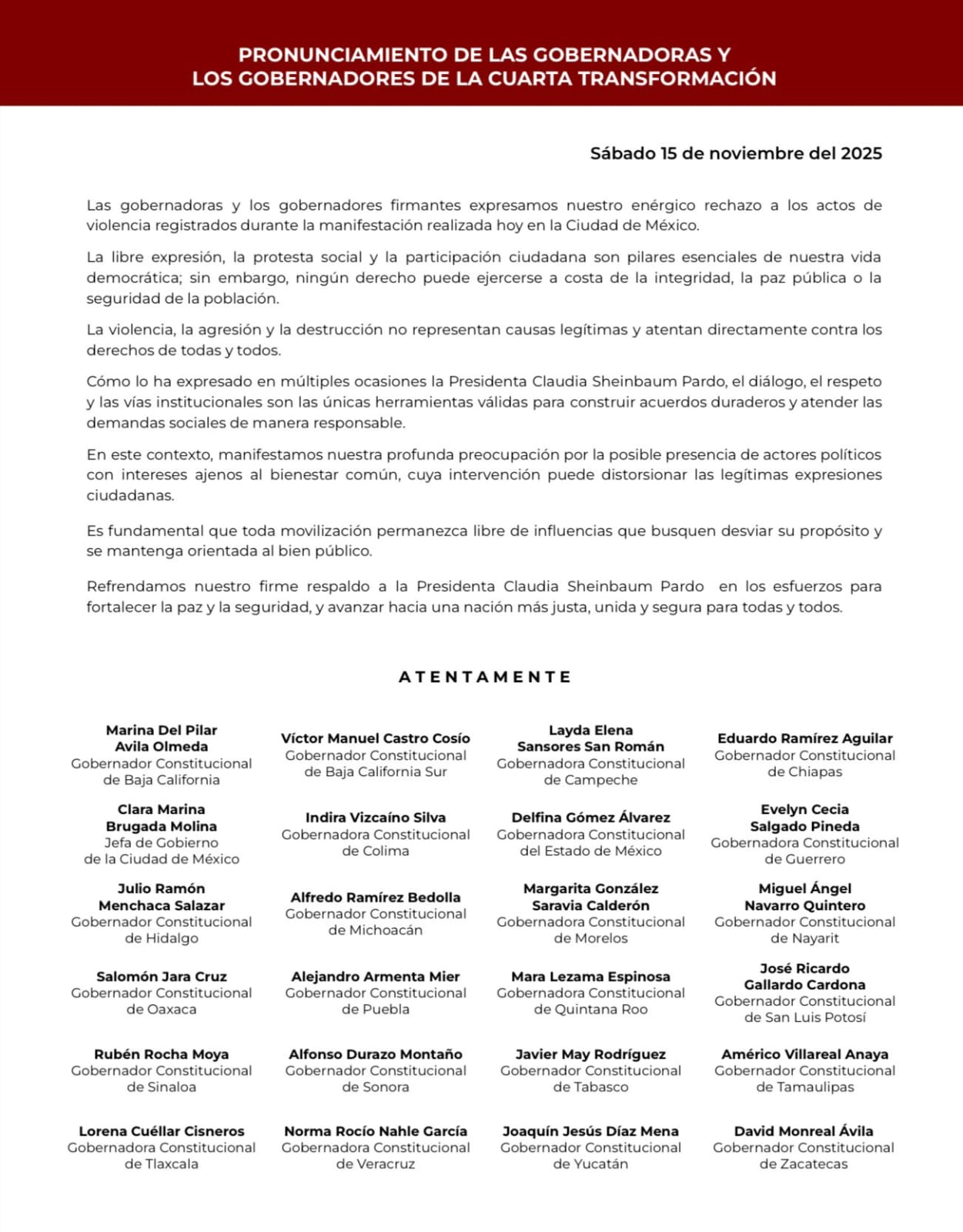 La gobernadora Marina del Pilar Avila Olmeda se pronunció: «rechazamos los actos de violencia registrados hoy en la manifestación en la Ciudad de México. La libre expresión debe ejercerse con respeto y sin poner en riesgo a nadie. Respaldamos a la Presidenta Claudia Sheinbaum, en su compromiso con La Paz, el diálogo y la construcción de acuerdos para México».