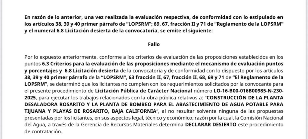 PLAYAS DE ROSARITO, BAJA CALIFORNIA A 25 DE NOVIEMBRE DE 2025.- La Comisión Nacional del Agua (Conagua) declaró ayer desierto el proceso de licitación pública nacional para la construcción de la planta desaladora Rosarito y la planta de bombeo para el abastecimiento de agua potable para Tijuana y Playas de Rosarito.