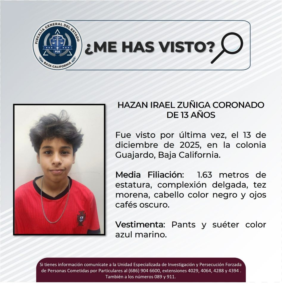 MEXICALI, BAJA CALIFORNIA, A 14 DE DICIEMBRE DE 2025.- La Fiscalía General del Estado a través de la Unidad para la Investigación y Persecución de Delitos de Desaparición Forzadas de Personas y Desaparición Forzada cometida por Particulares, solicita la colaboración de los ciudadanos para localizar a Hazan Israel Zuñiga Coronado de 13 años.