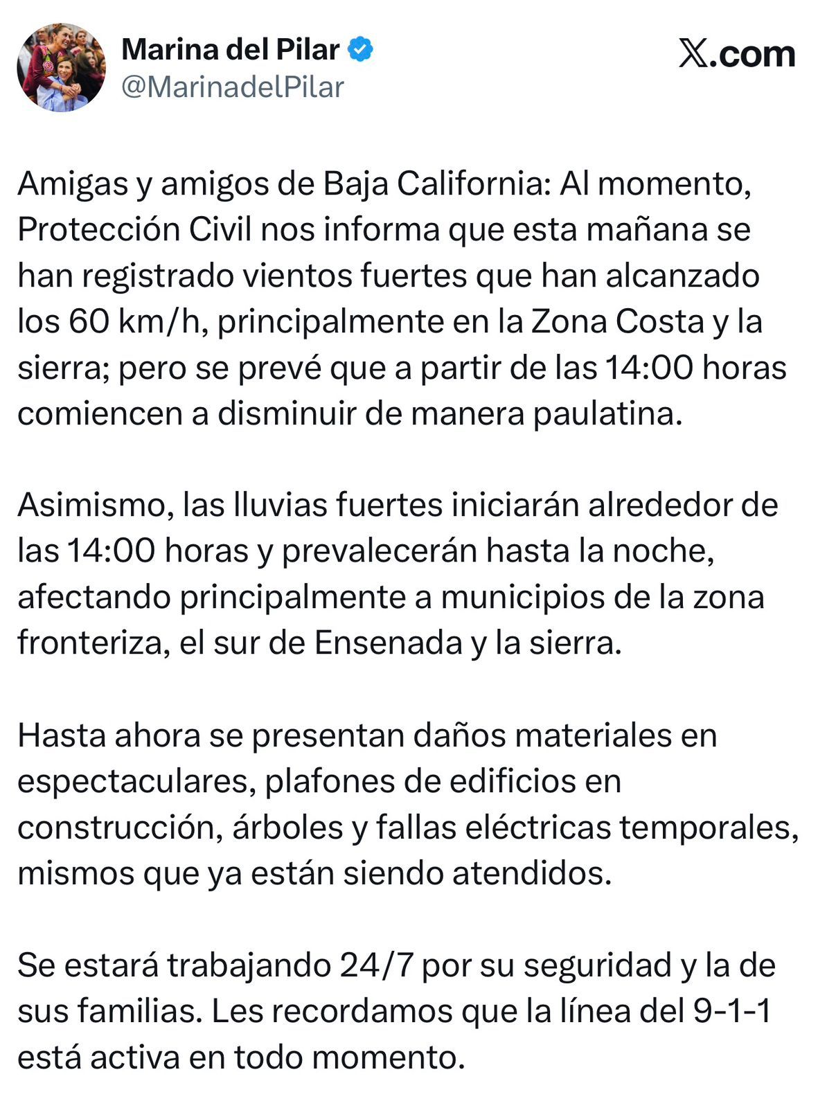 Detalló que, de acuerdo con Protección Civil, las lluvias fuertes iniciarán alrededor de las dos de la tarde y se mantendrán durante la noche, con mayor impacto en municipios de la zona fronteriza, el sur de Ensenada y áreas serranas.