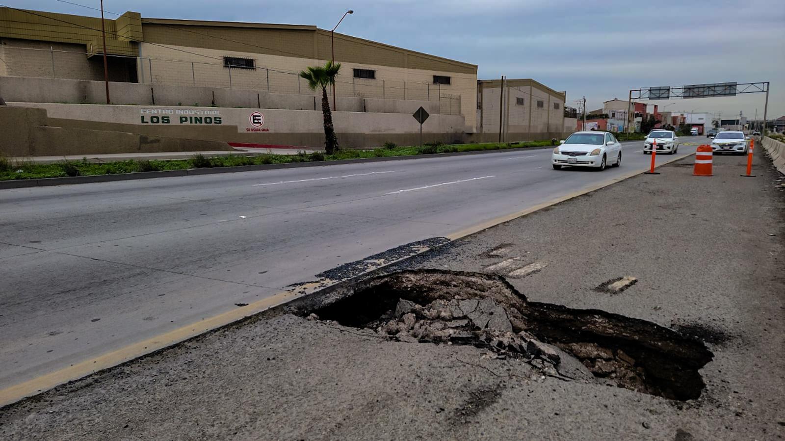 TIJUANA.-Nuevo socavón aparece en la Vía Rápida Poniente, a la altura del Centro Industrial Los Pinos, cerca del puente vehicular Simón Bolívar.
