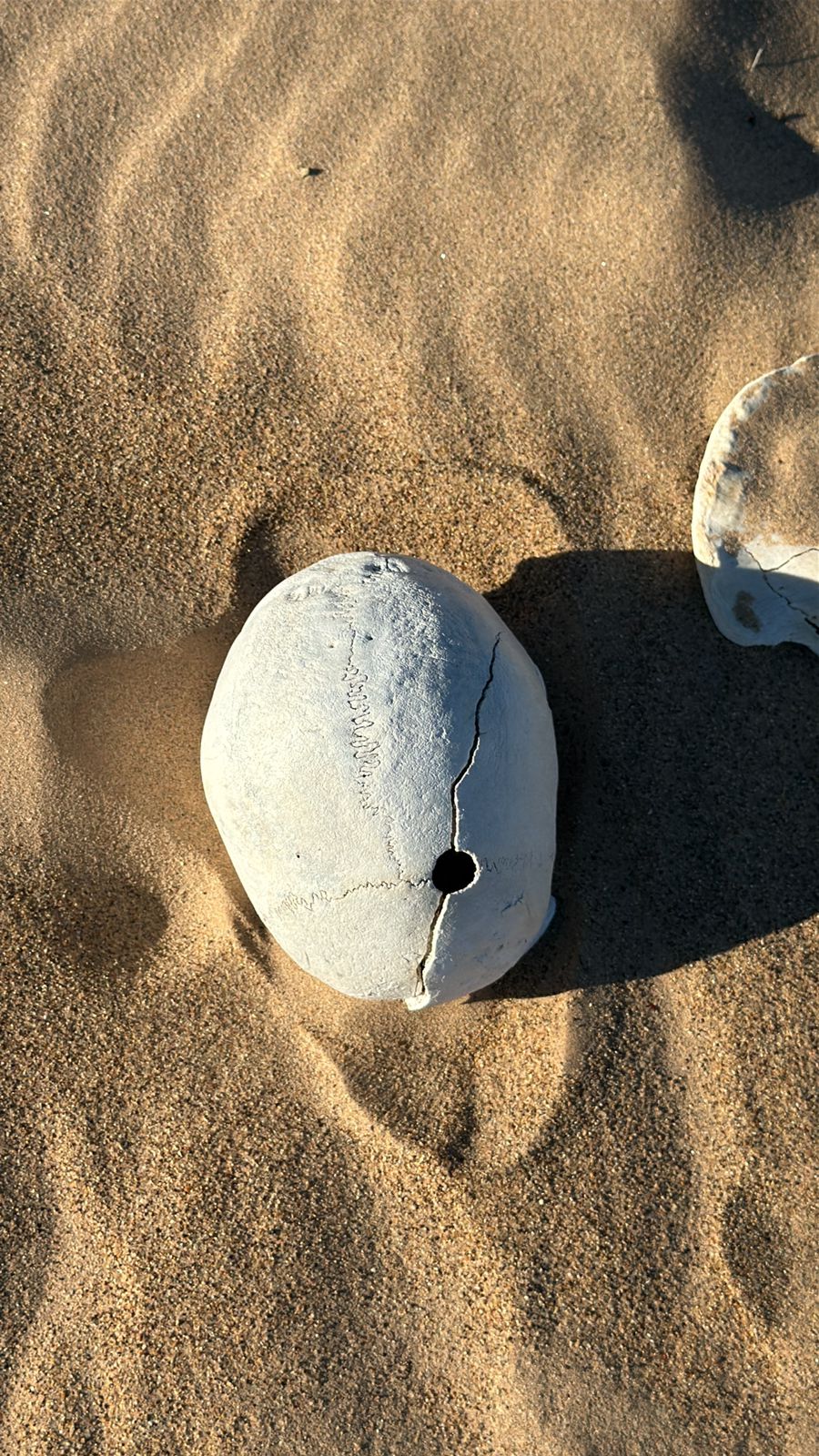 Uno de los huesos es el cráneo, con huellas de un orificio que parece un disparo de arma de fuego.