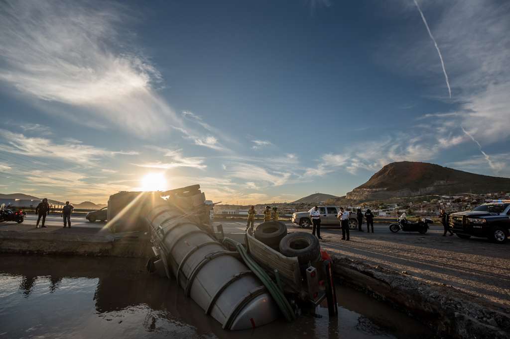 De acuerdo con los primeros reportes, el conductor de la unidad perdió el control cuando el tráiler intentó realizar una vuelta sin lograr maniobrar adecuadamente, lo que provocó que la pipa terminara volcada sobre la vialidad.