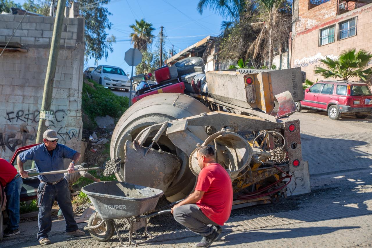 TIJUANA.-Una máquina revolvedora de cemento terminó volcada la mañana de este martes 13 de enero, alrededor de las 8:00 horas, sobre la calle Mezquites, a la altura de la Prolongación Abedul, en la colonia Rinconada I.