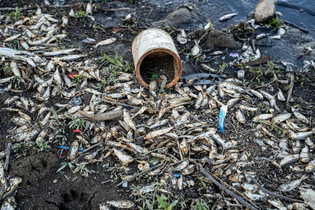 TIJUANA.-Miles de peces muertos pueden apreciarse por la orilla del vaso de la Presa Abelardo L. Rodríguez; son sardinas, de color gris oscuro en el dorso y el vientre de tono plateado. Los restos se mezclan entre residuos de todo tipo, desde ropa, plásticos y llantas.