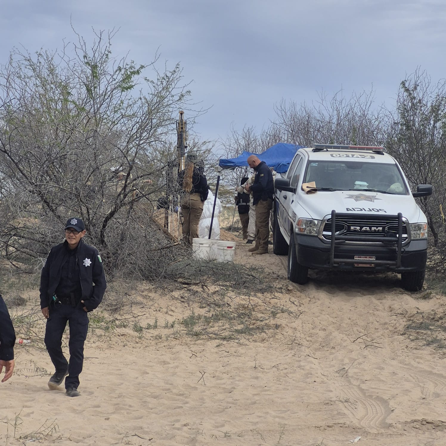 MEXICALI.- A unos 700 metros cruzan el aire dos aviones caza del ejército de EUA, mientras que en el lado mexicano policías de los tres niveles de gobierno participan en el descubrimiento de 23 cuerpos en 11 fosas hechas por criminales, donde no respetaron sexo y edad.