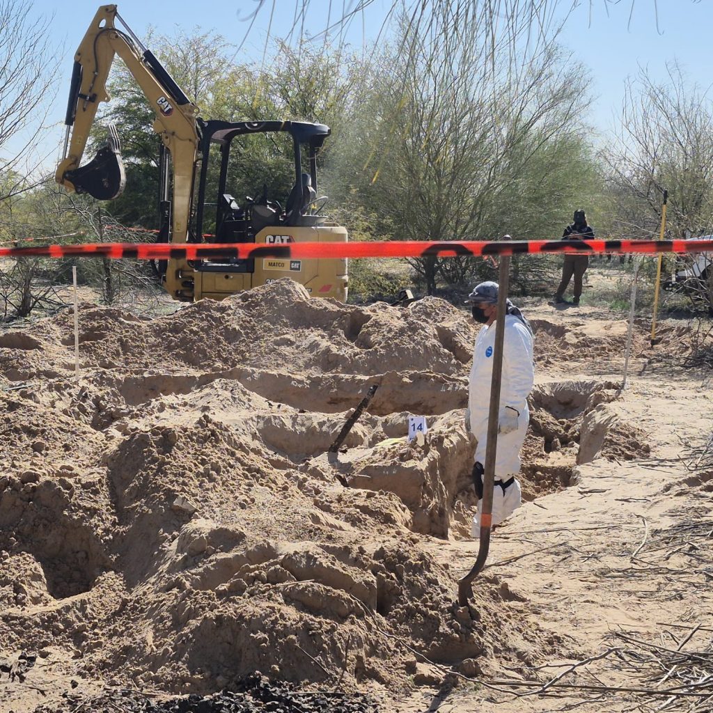 MEXICALI.-Fue abierta la fosa #14 localizando restos humanos que podrían pertenecer a 2 cuerpos, sumando en total 28 personas enterradas en este parque Pronatura, ejido Miguel Alemán, en el Valle de Mexicali, pegados a Arizona, Estados Unidos y San Luis Río Colorado, Sonora.