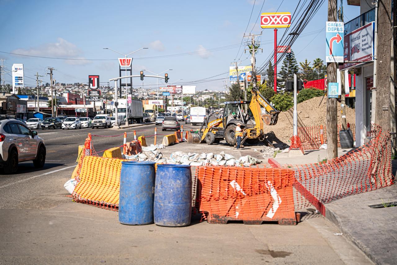PLAYAS DE ROSARITO.-Autoridades municipales del Ayuntamiento de Playas de Rosarito llevan a cabo labores de reparación debido al socavón registrado en el cruce de los bulevares Benito Juárez y Hisense, en sentido de sur a norte, a la altura de la colonia Lucio Blanco.