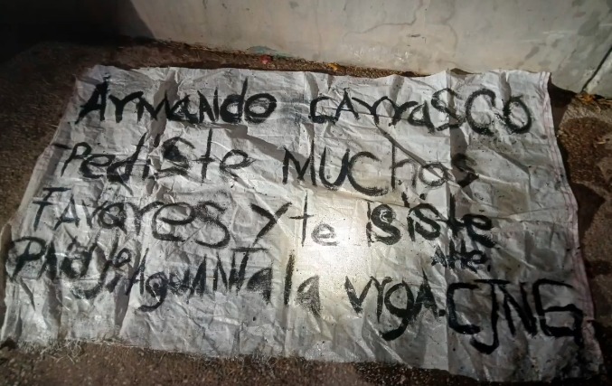 Carrasco ya tiene varias amenazas en su contra por parte del crimen organizado, el 12 de marzo de 2024 también fue instalada otra narcomanta, pero incluyó al secretario de Bienestar del Estado, Netzahualcóyotl Jáuregui y otro funcionario de nombre Oliver Herrero.
