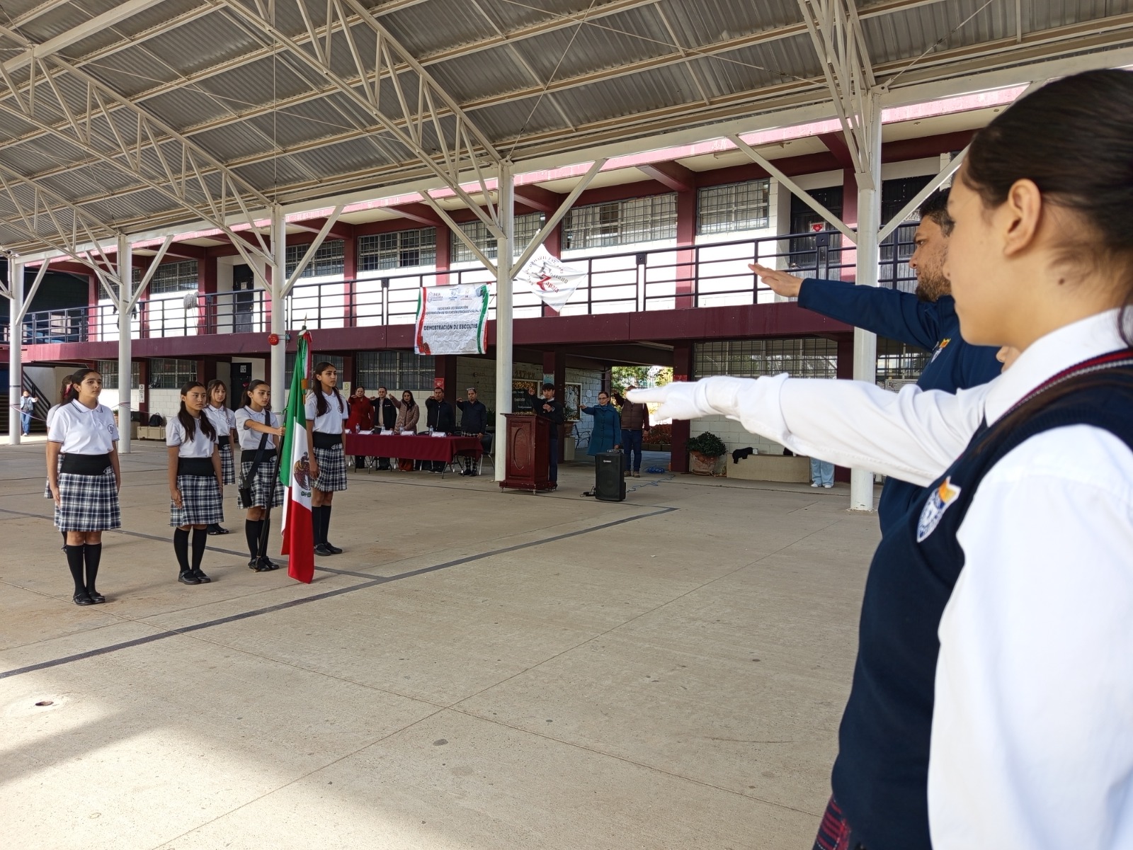 Cada institución presentó una demostración de escolta ante autoridades educativas, madres y padres de familia, así como comunidad escolar en general, mostrando disciplina, coordinación y respeto a los símbolos patrios.