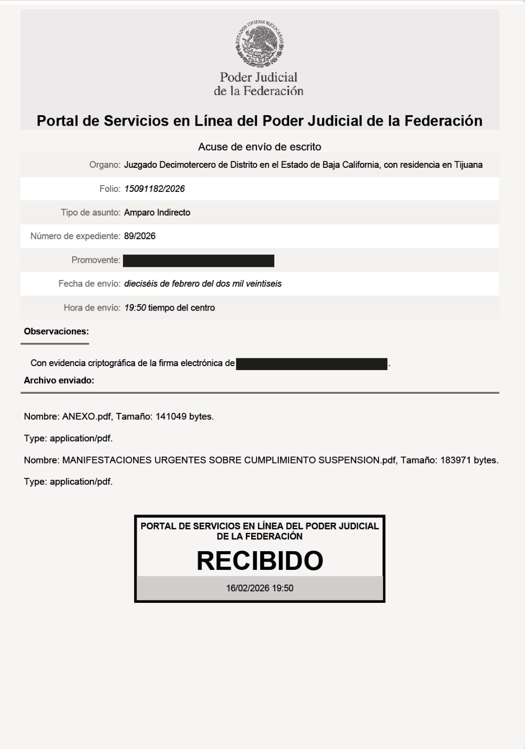 “Al no recibir una respuesta concreta ni permitirnos realizar el depósito, informamos en el Juzgado Decimotercero de Distrito en el Estado de Baja California que nos presentamos con la intención de cubrir la garantía y que fuimos obstaculizados. No hay intención de incumplir; al contrario, queremos cumplir exactamente como lo ordenó el juzgado”, sostuvo.