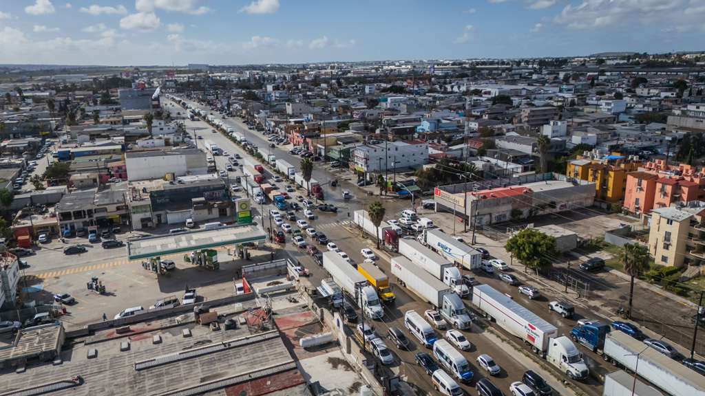 La acumulación de unidades pesadas ha generado una fila que se extiende por varios kilómetros, impactando también a los automovilistas que circulan por la zona, quienes enfrentan tráfico lento y congestionamiento en vialidades aledañas al bulevar de acceso al cruce internacional y a la carretera Aeropuerto.