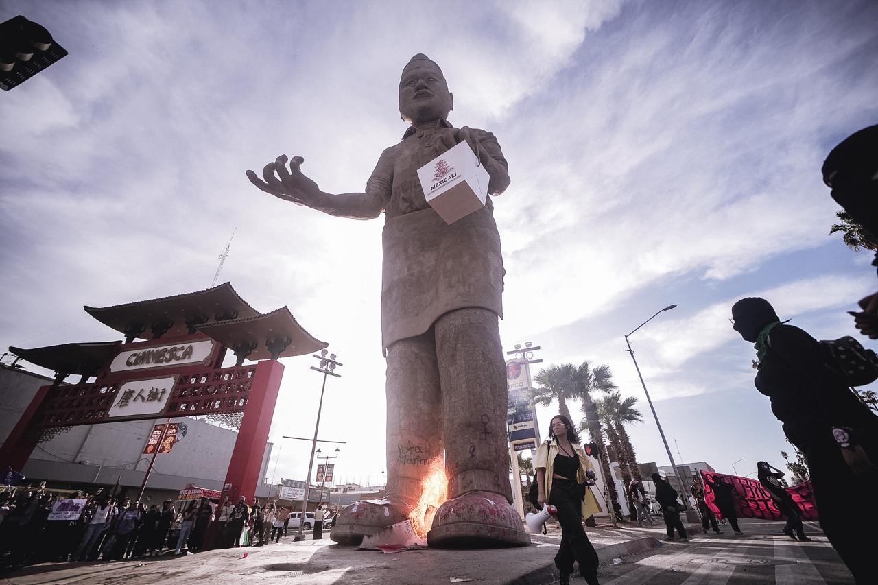 Las mujeres, a ritmo de tambores y cantando letras sobre respeto y empoderamiento, llegaron al nuevo monumento de Mexicali: el Cocinero Chino, el cual fue el núcleo de la manifestación al ser la zona donde se intervino con pintura y se quemaron los carteles.