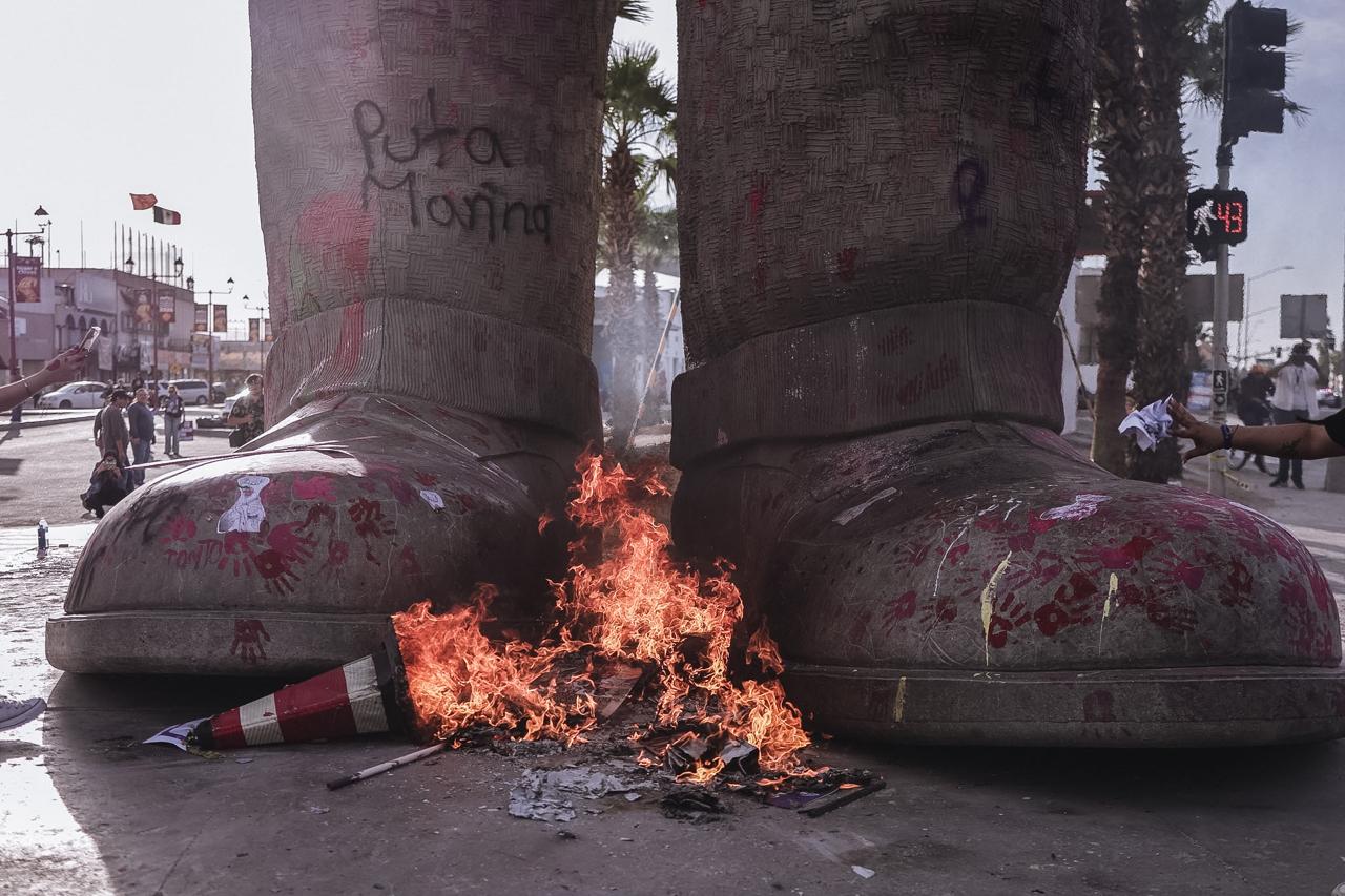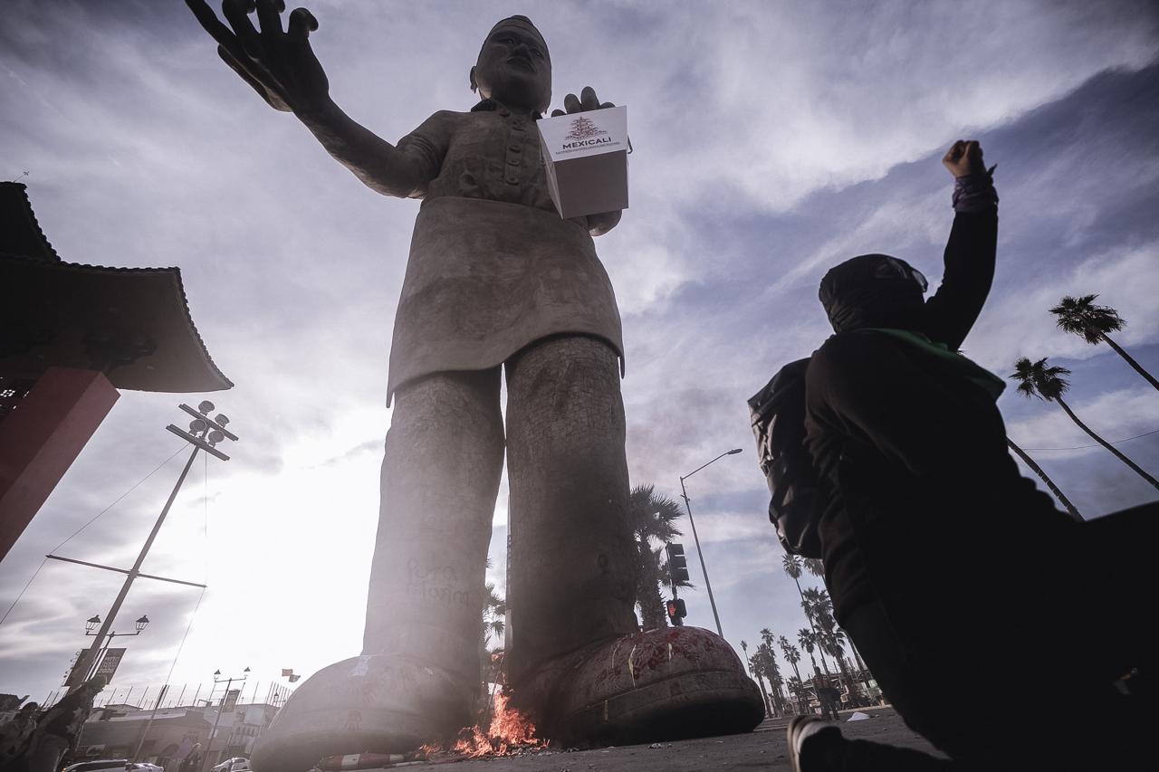 Las mujeres, a ritmo de tambores y cantando letras sobre respeto y empoderamiento, llegaron al nuevo monumento de Mexicali: el Cocinero Chino, el cual fue el núcleo de la manifestación al ser la zona donde se intervino con pintura y se quemaron los carteles.