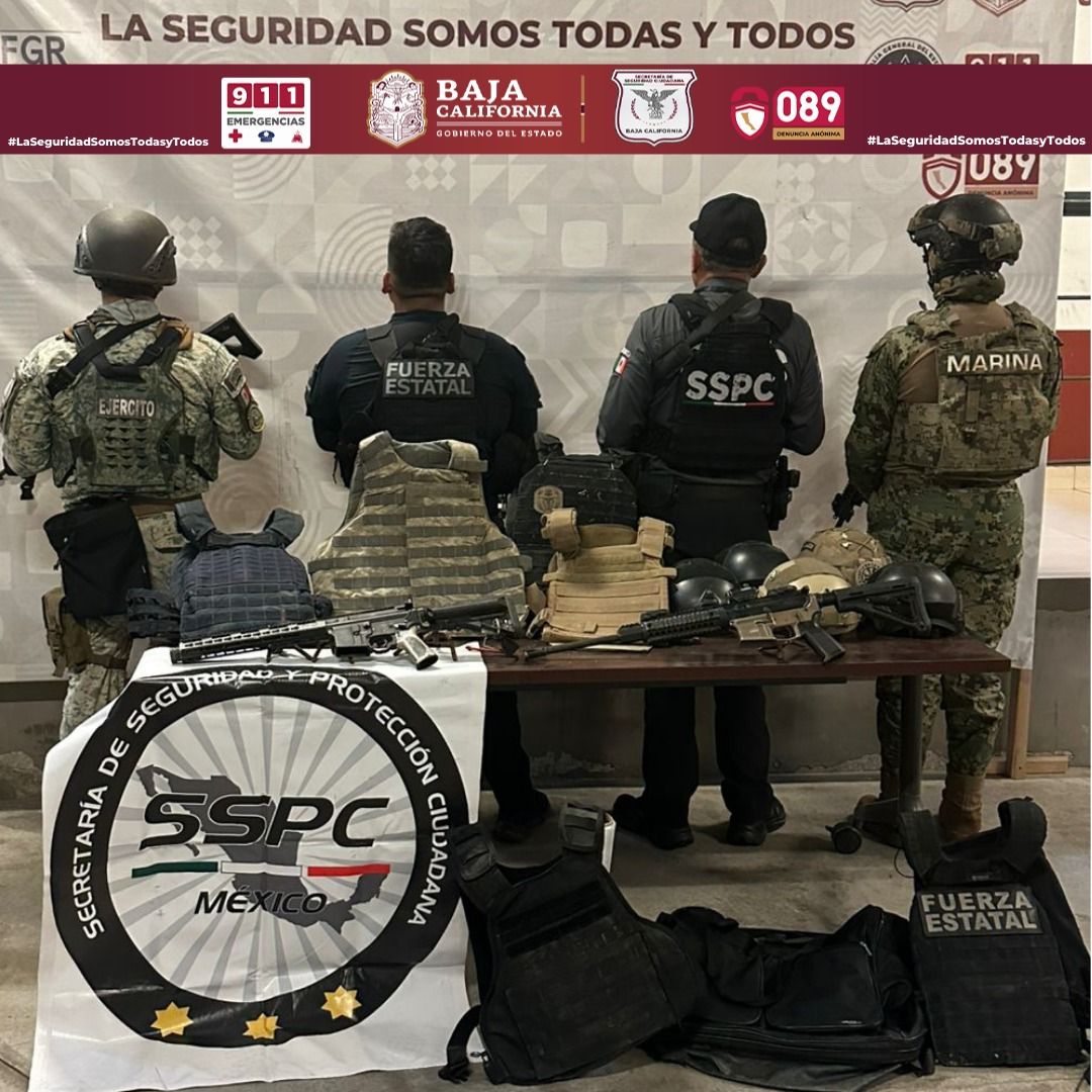 TIJUANA.- Durante un despliegue operativo coordinado en la ciudad de Tijuana, integrantes de las Fuerzas de Seguridad en Baja California aseguraron armas de fuego, equipo táctico y un vehículo con reporte de robo en la colonia Los Alcatraces.